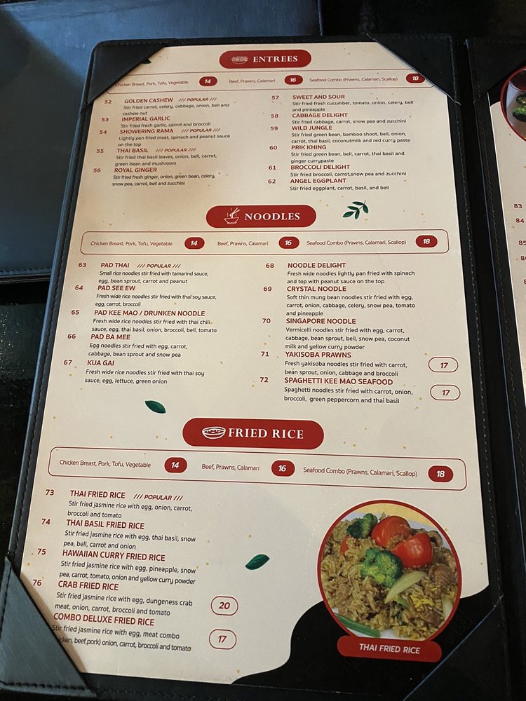 Thai Rhapsody boasts not just a well-curated menu but also an atmosphere that is cozy and inviting—perfect for casual dining with friends or a romantic evening out. Guests can indulge in unique offerings like Hawaiian Curry Fried Rice and Mango Drop cocktails, showcasing the chef's commitment to delivering authentic Central Thai cuisine. With options for vegetarian diners and swift service, this restaurant offers convenience and comfort.
